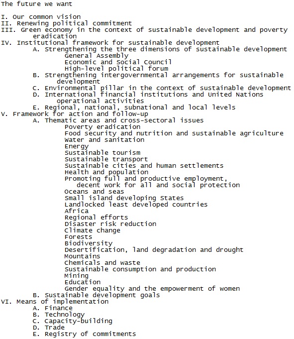 RIO+20, JUNE 13-22, 2012 Prepcom, SDD, Partnership Forum, Conference, Side Events Commons Vision | Commons Meetings | People's Summit Dutch Cyling Side Event | Delta Award | Consul Breakfast Meeting CONFERENCE, JUNE 20-22Go to: Jun. 20 | Jun. 21 | Jan. 22 2012FINAL OUTCOME DOCUMENT "THE FUTURE WE WANT"